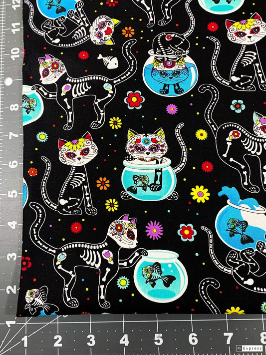 Sugar Skull Cat fabric C4159 skeleton cat cotton fabric w Fish