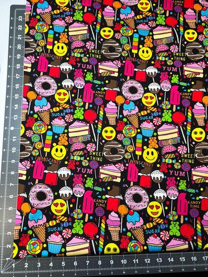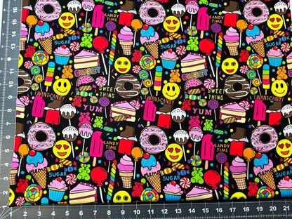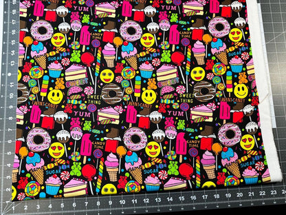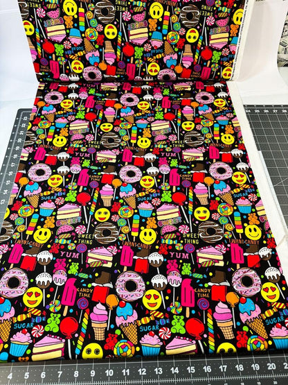 Indulge your sweet tooth with Black I Want Candy fabric by Corey Paige. Enjoy the playful print featuring lollipops, popsicles, donuts, and more sugary treats. Made with soft cotton, this fabric is perfect for any sweet project. Grab your own slice of sweetness with this fabric today Perfect for Halloween Trick or Treat bag or a pillow case for the best sweet dreams