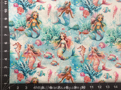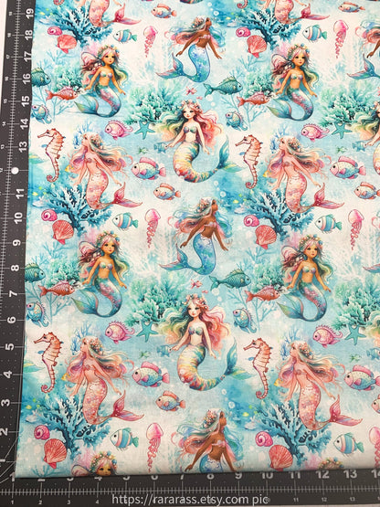 Unleash your inner mermaid with our stunning Blue Mermaid fabric CD3547. This underwater-themed design features enchanting mermaids swimming gracefully amid sea creatures and coral reefs. Made from high-quality material, this fabric is perfect for creating unique garments, home decor, and accessories that capture the magic of the ocean.