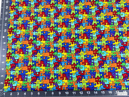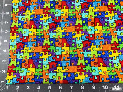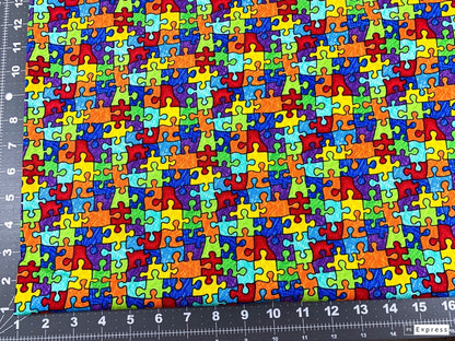 Elevate your DIY game with our bright puzzle piece fabric. The unique pattern of interlocking puzzle pieces will add a fun and whimsical element to your projects. This fabric is perfect for anyone looking to add a touch of personality and flair to their creations. With fabric by the yard, you can easily customize the amount you need for each project, making it a cost-effective and versatile choice for all your crafting needs.