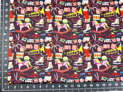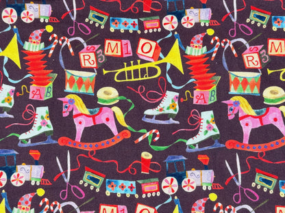 Get in the holiday spirit with our festive Christmas fabric! Perfect for making gifts and toys, this cotton fabric features playful images of ice skates, trumpets, jack in the box, trains, hobby horses, and rocking horses. Let your inner child run wild this season!
