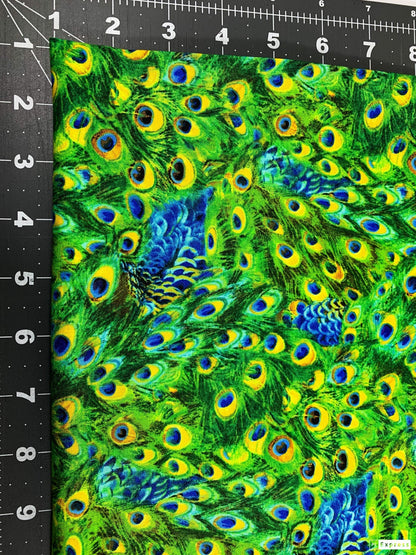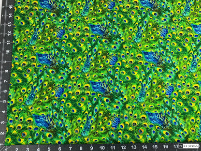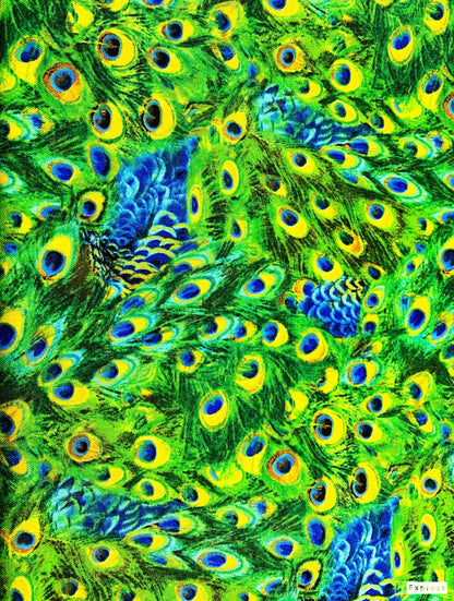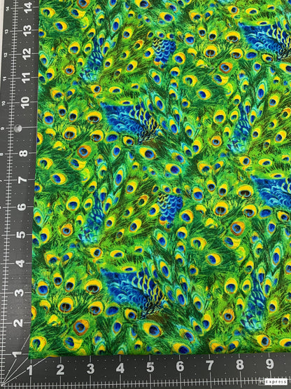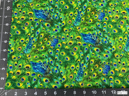 Add a touch of whimsy to your quilting projects with our Exotica Peacock feather fabric. This vibrant green cotton fabric features a colorful print of peacock feathers, perfect for edging in a peacock quilt or as a unique quilt backing. Get creative and let your imagination fly!