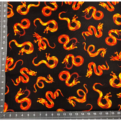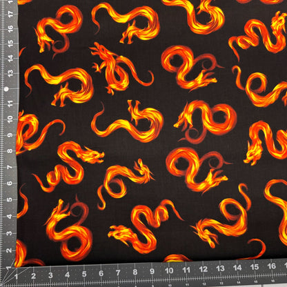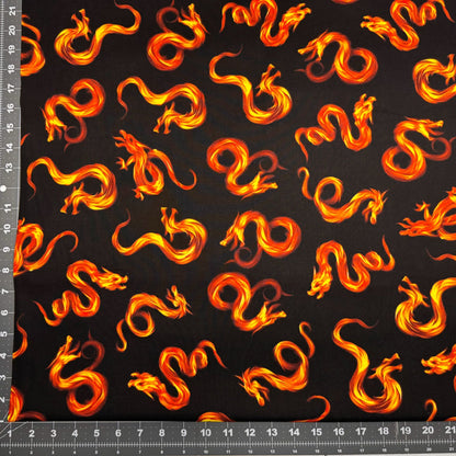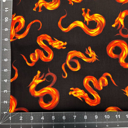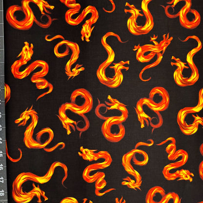 Bring a spark of magic to your projects with this Fire Dragon cotton fabric from Timeless Treasures. Featuring fierce dragons breathing fire against a bold black background, it’s perfect for adding a touch of fantasy and adventure to quilts, costumes, or home décor. Let your creativity roar to life with this playful and striking fabric!