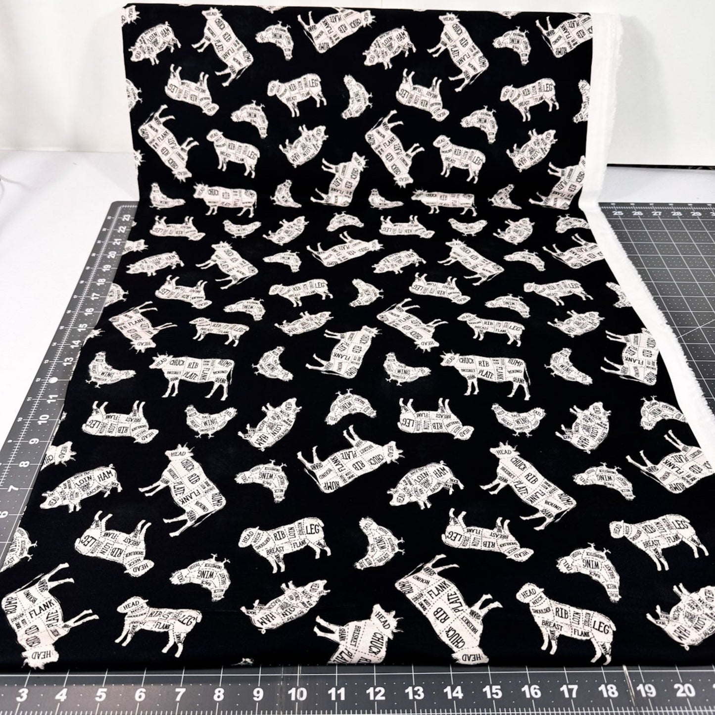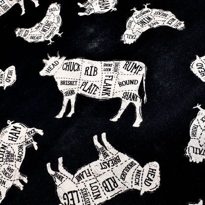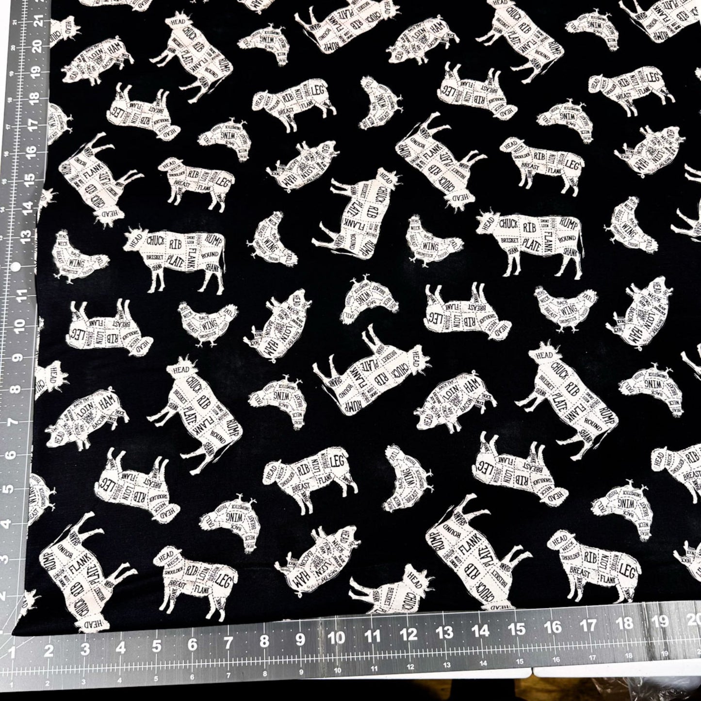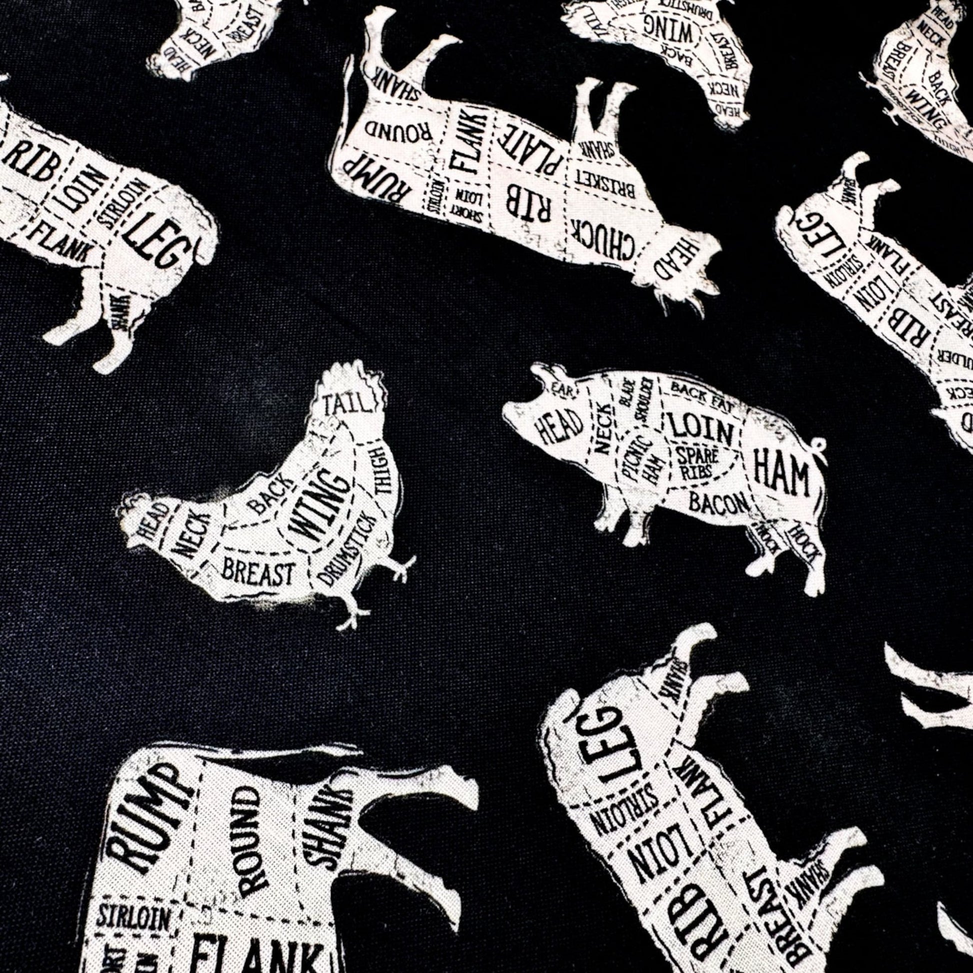 Bring some sizzle to your shopping with the King of the Grill fabric CD1334! Featuring bold black-and-white butcher meat cuts on soft cotton, this playful fabric is perfect for crafting a sturdy, stylish grocery bag that’s as fun as it is functional. Whether you’re hauling veggies or steaks, this fabric adds a tasty twist to your everyday errands.