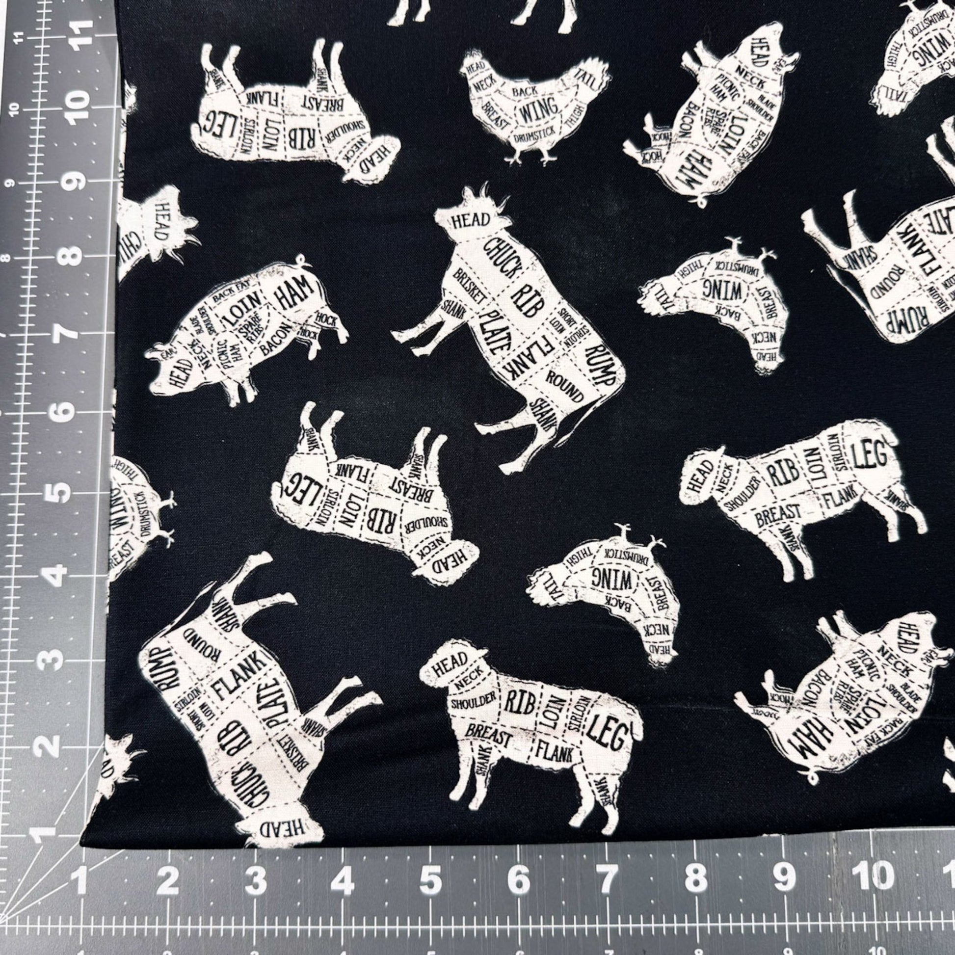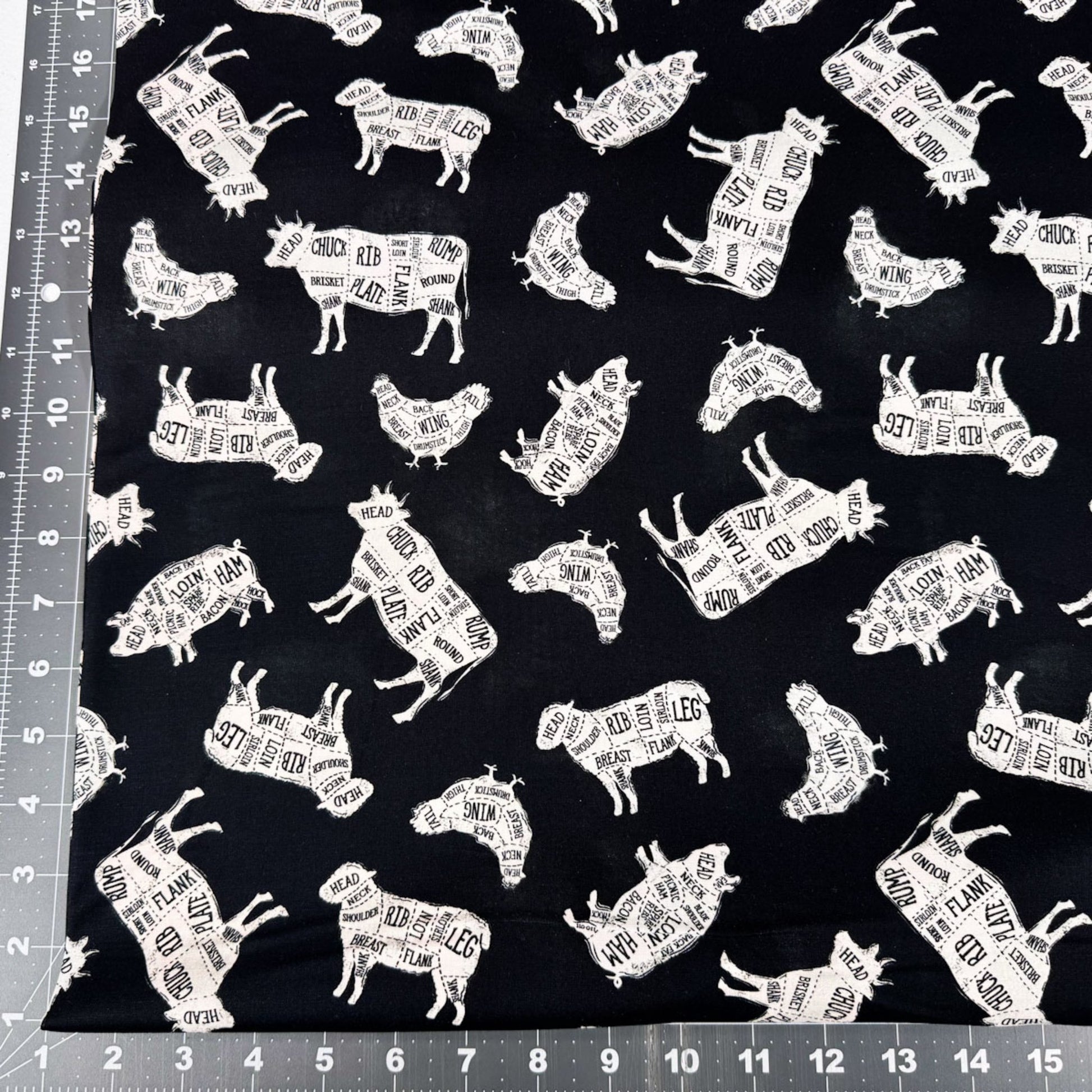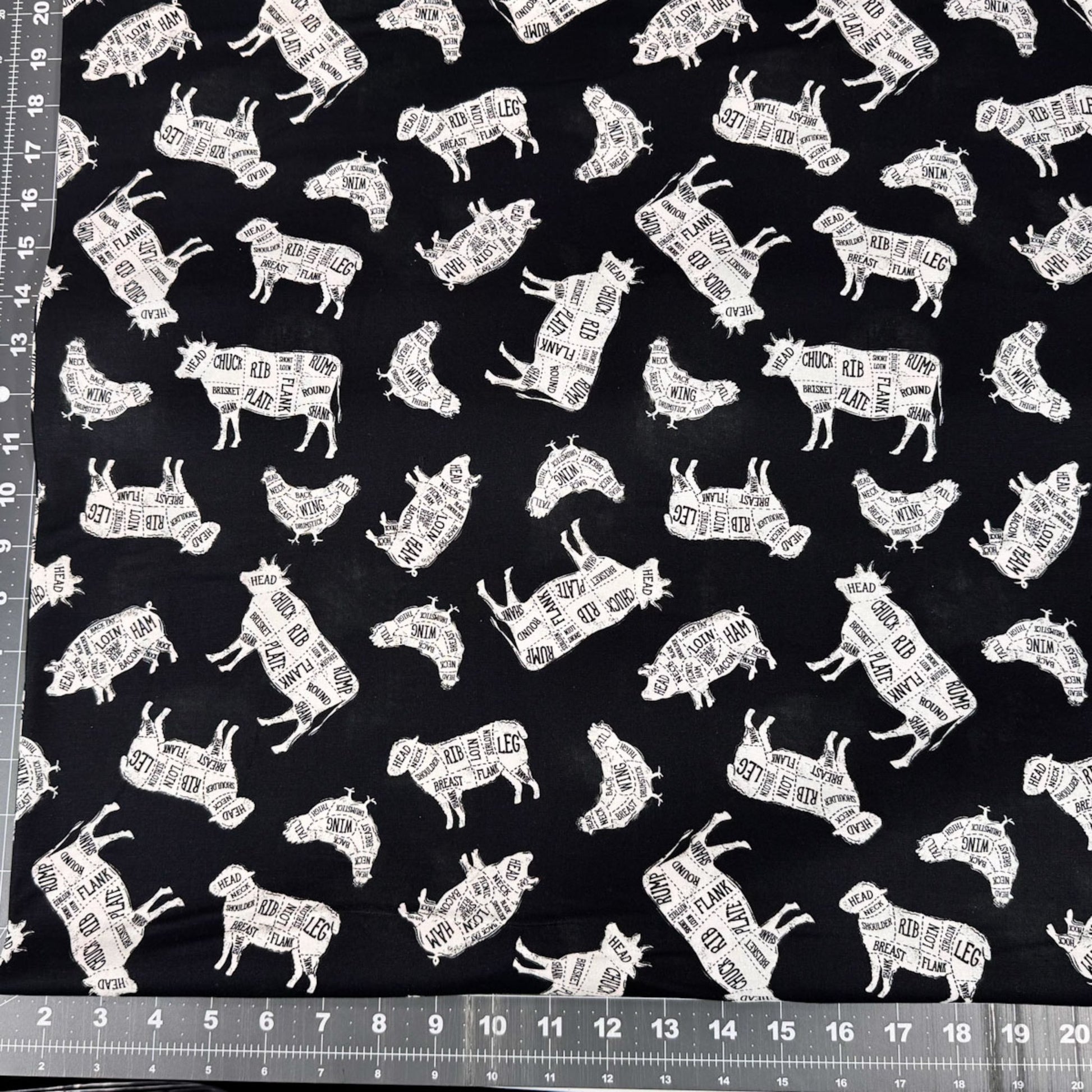 Bring some sizzle to your shopping with the King of the Grill fabric CD1334! Featuring bold black-and-white butcher meat cuts on soft cotton, this playful fabric is perfect for crafting a sturdy, stylish grocery bag that’s as fun as it is functional. Whether you’re hauling veggies or steaks, this fabric adds a tasty twist to your everyday errands.