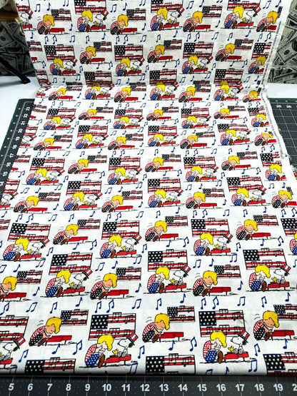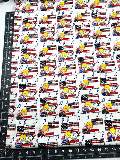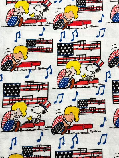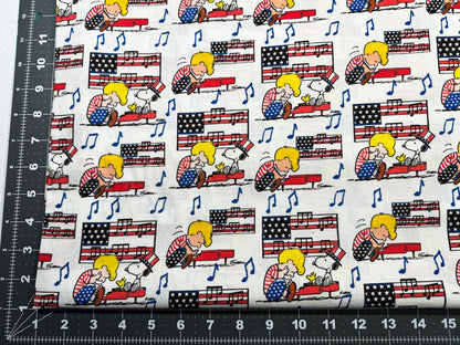 Celebrate Independence Day with Linus and Snoopy! Featuring Linus playing piano while Snoopy sings, Snoopy in his USA red white and blue hat surrounded by American flags. Perfect for adding a touch of whimsy and Americana to your sewing projects. Let Linus and Snoopy jazz up your crafting game!