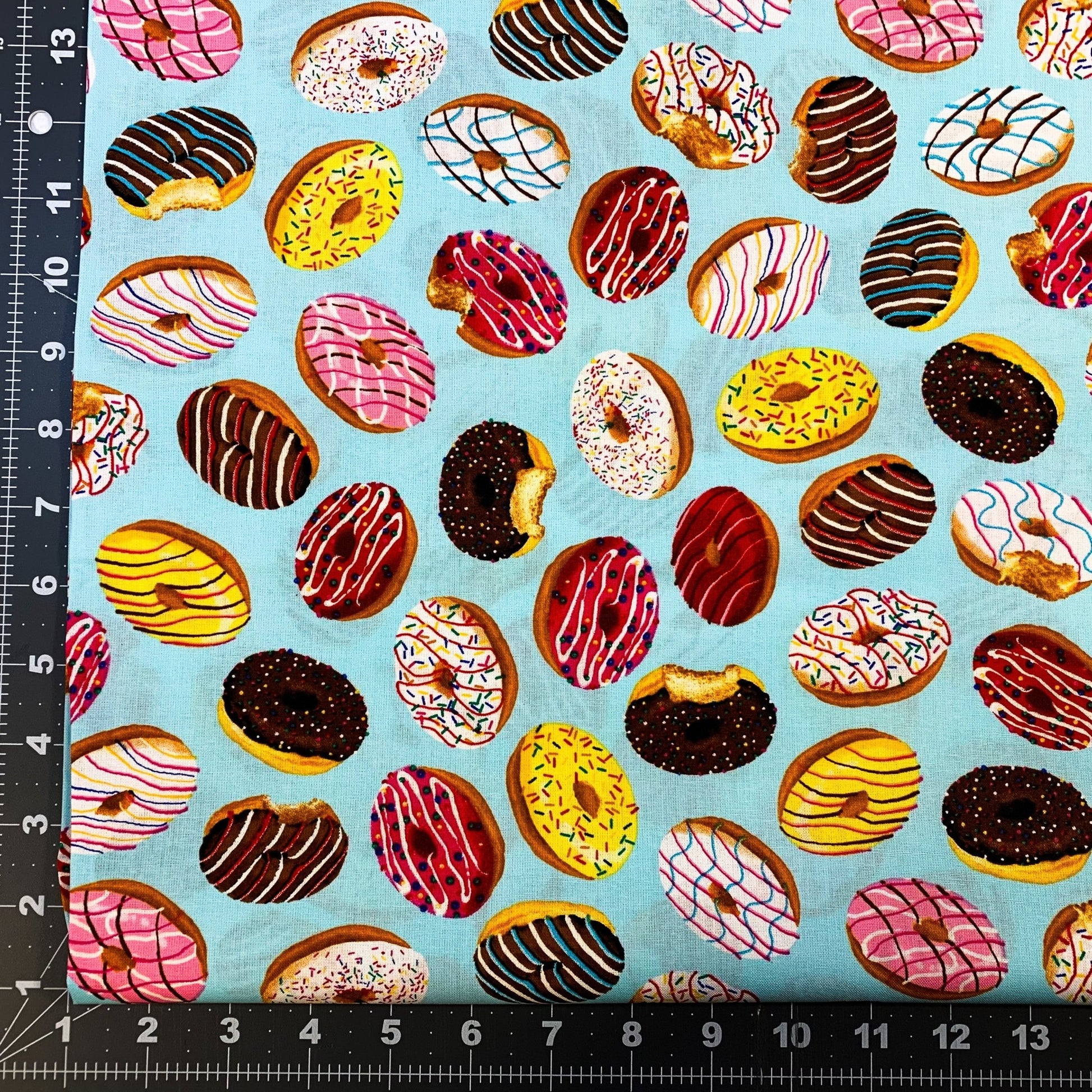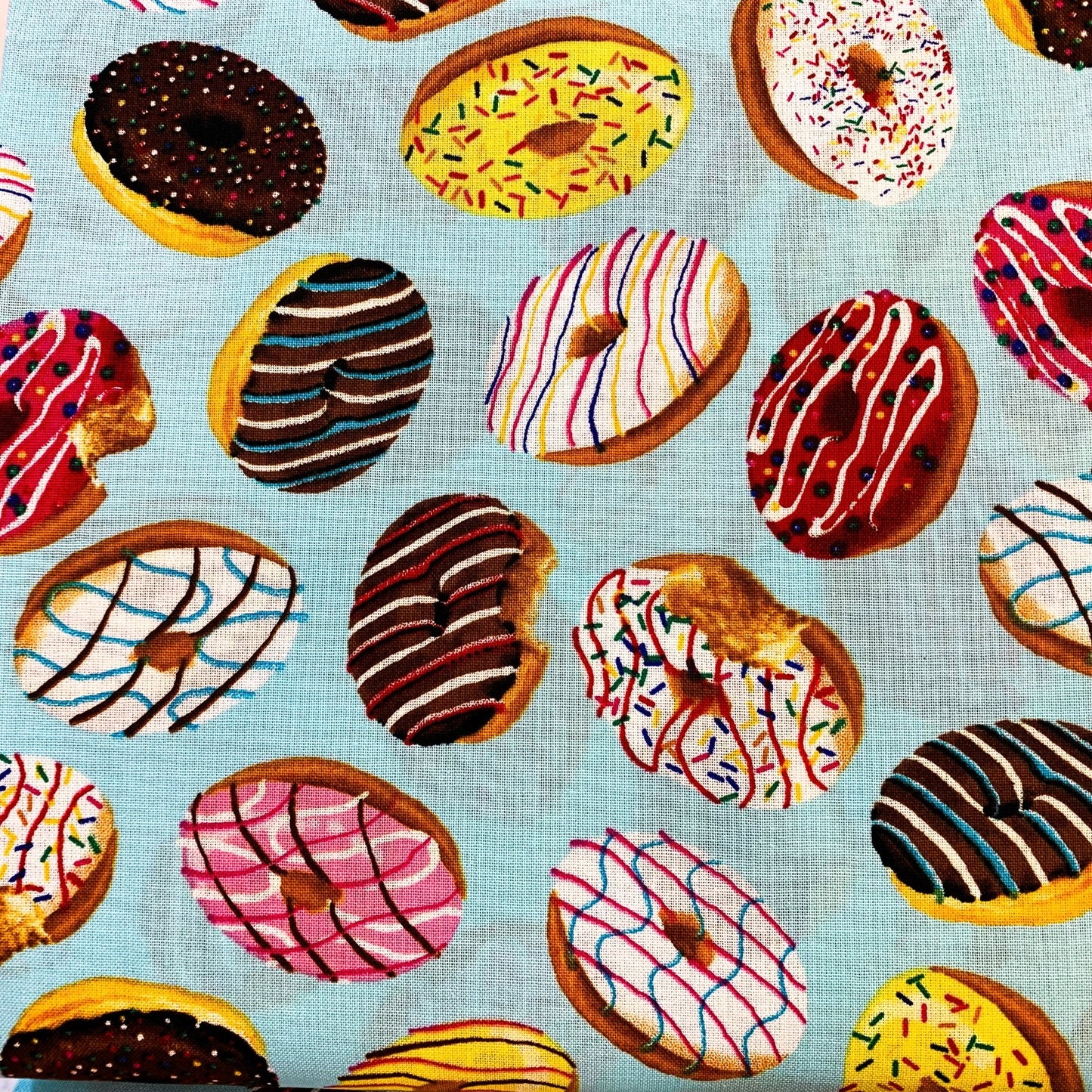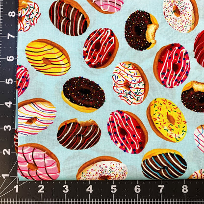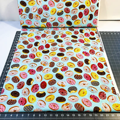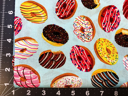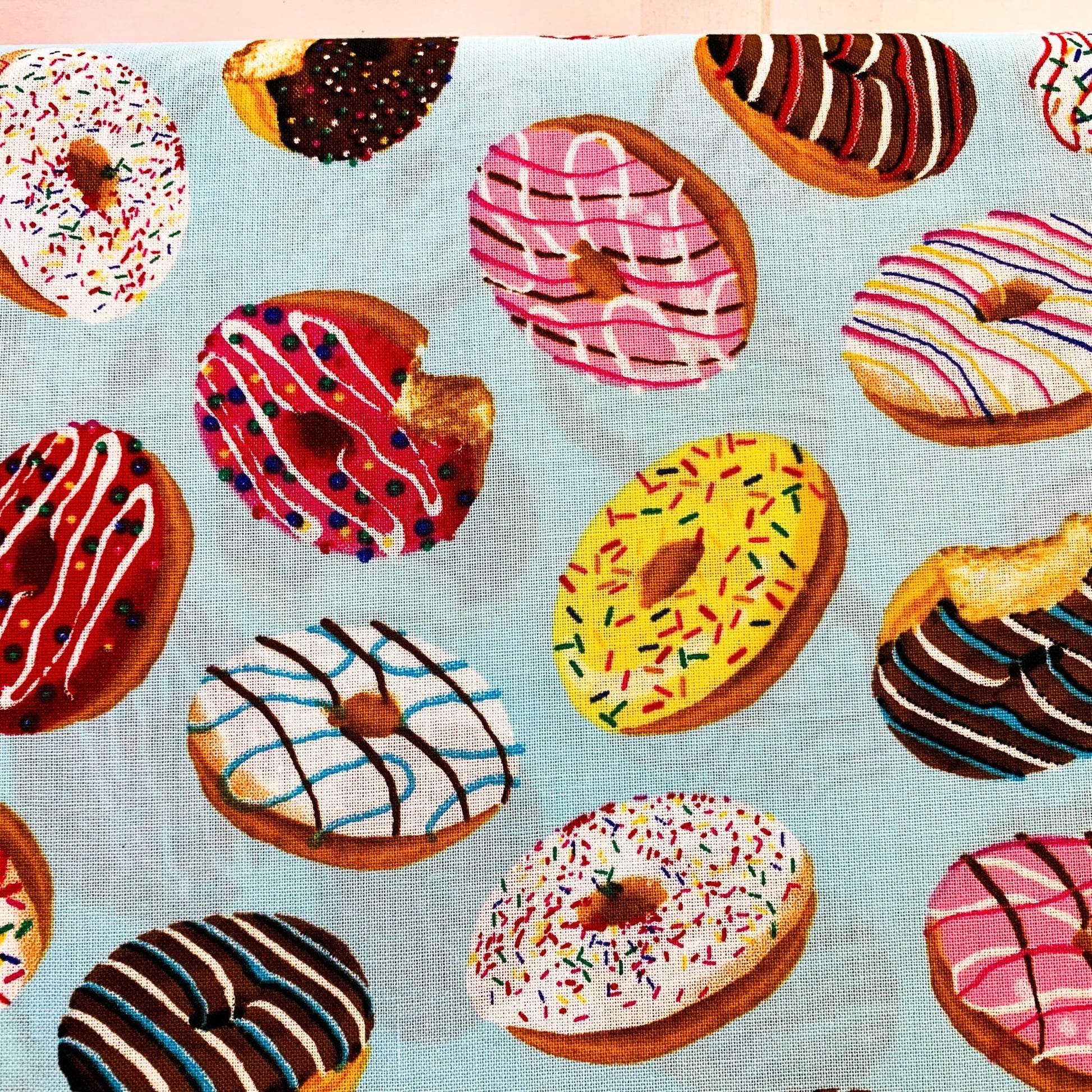 This light blue cotton fabric features a playful pattern of iced donuts topped with colorful sprinkles, perfect for adding a fun and sweet touch to your sewing projects. Its soft texture and cheerful design make it ideal for crafting lively apparel, accessories, or home décor that will brighten any space. I love donuts and pillow cases so I can dream of sweet donuts fabric.