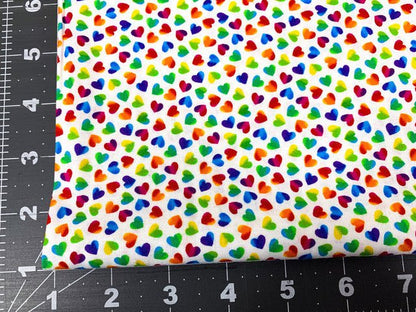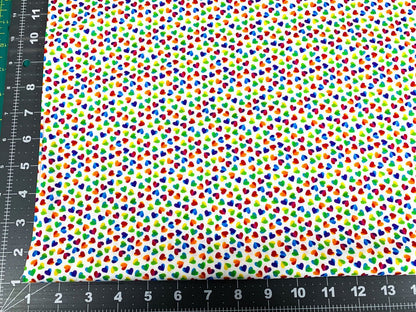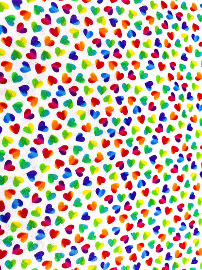 Bring a pop of color to your next sewing project with our Mini Rainbow Hearts Fabric in White. This playful cotton fabric features a whimsical design of miniature rainbow-colored hearts scattered across a crisp white background. Perfect for creating fun and cheerful apparel, accessories, or home decor items that will brighten up any space.