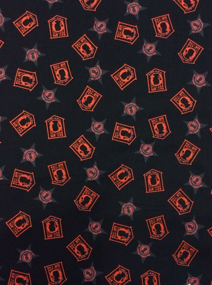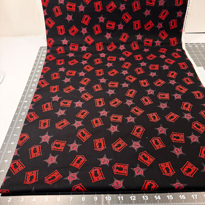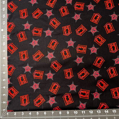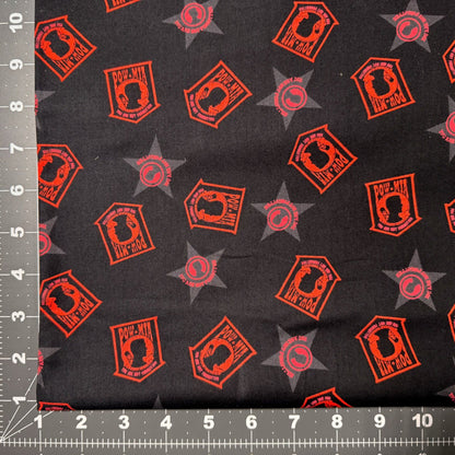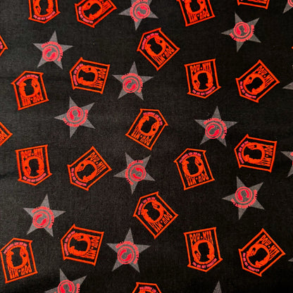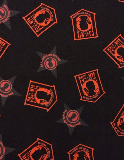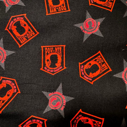 Celebrate courage with this playful POW MIA military cotton fabric featuring Missing in Action badges. Perfect as a bold accent in your military quilt of valor, it adds a meaningful touch while honoring heroes. Durable and authentic, this fabric brings both spirit and style to your creative projects. Red badges on a black cotton background