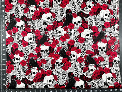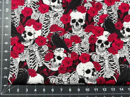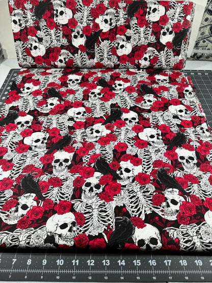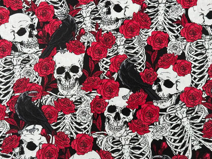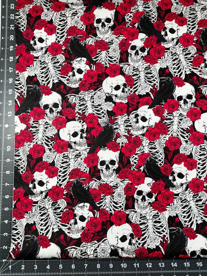 Get quirky with your fabric designs with our Red Rose and Skull fabric! Made with 100% cotton, this novelty fabric features vibrant red roses and smiling skulls. Perfect for adding a playful touch to any project.