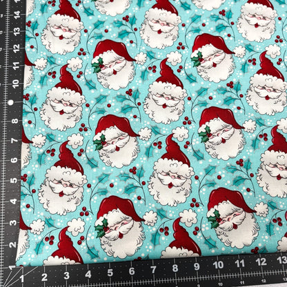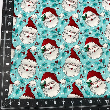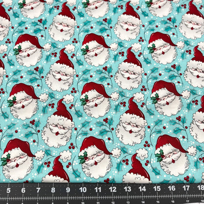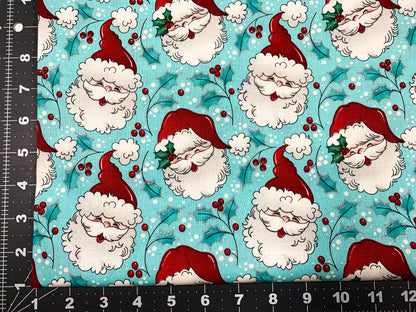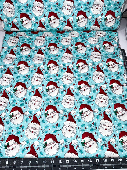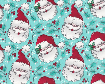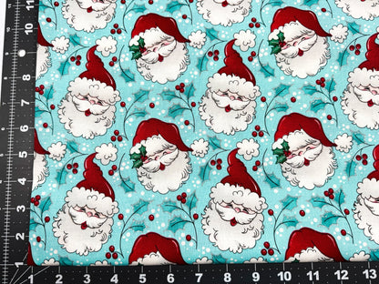Get into the holiday spirit with this charming Christmas fabric featuring tossed Santa faces. The delightful design is perfect for creating festive decorations, homemade gifts, or unique apparel. Each Santa face is adorned with glitter, adding a touch of sparkle and magic to your creations.