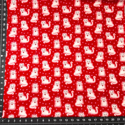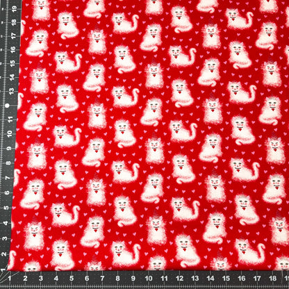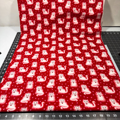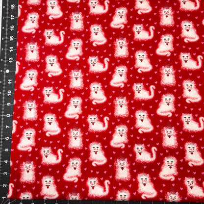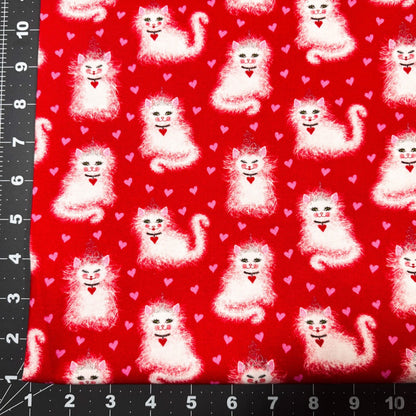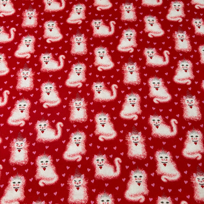 Adorable white kittens frolic among vibrant red and pink hearts on this charming cotton fabric. Perfect for quilting, crafting, or sewing cute accessories, this playful design brings feline charm to any project. The high-quality cotton ensures durability while maintaining a soft feel that's easy to work with.